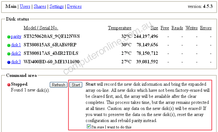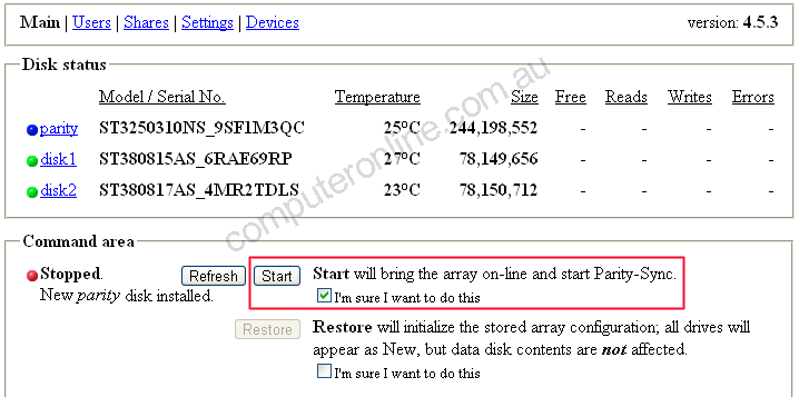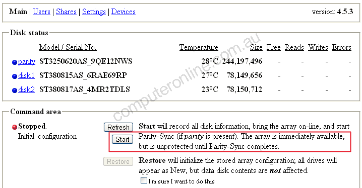 - Main page -> Start will bring the array on-line, start Data-Rebuild... ->