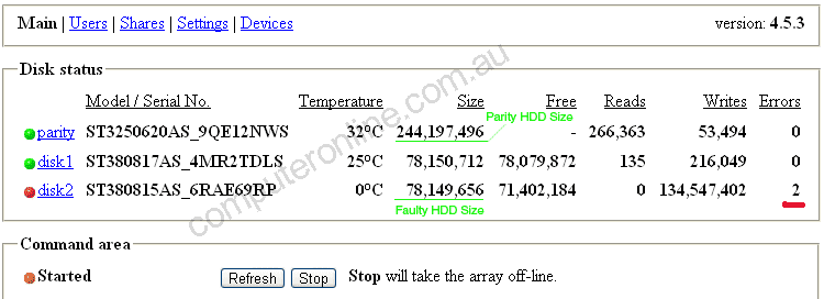 This is the Main page of the file server management. It shows you each hard disk's status, size, model, serial number etc.