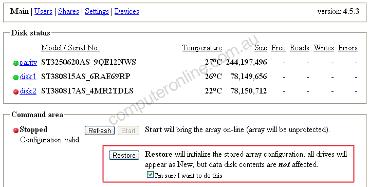 - Main page (the file server management) -> Stop the server (take the Hard Disk array off-line)